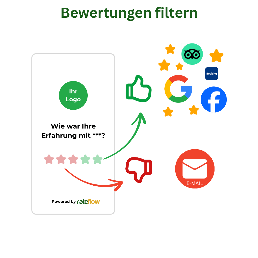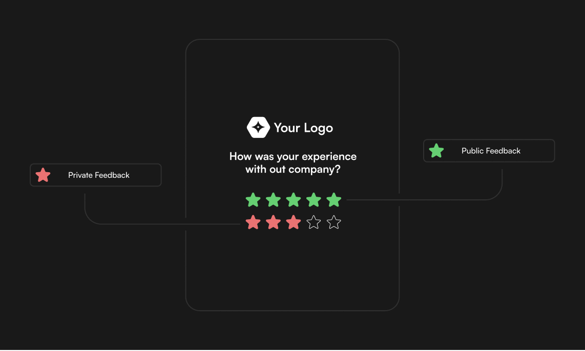 Ihr Bewertungslink, den Sie an Ihre Kunden senden, enthält eine Bewertungsfilter-Seite. Abhängig von der Sternebewertung, die ein Kunde Ihnen gibt, wird entweder ein privates Feedback-Formular (1-3 Sterne) oder eine Seite angezeigt, auf der eine öffentliche Bewertung auf einem Ihrer integrierten Konten hinterlassen werden kann (4-5 Sterne).