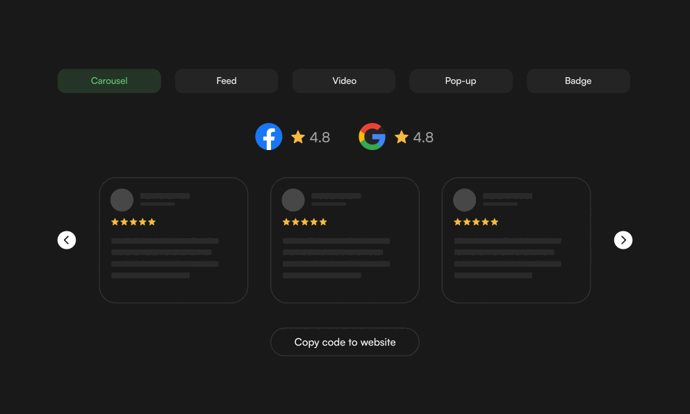 Mit Rateflow können Sie Widgets erstellen, um Ihre besten Bewertungen auf Ihrer Website anzuzeigen und so Ihre Glaubwürdigkeit zu erhöhen. Hierfür brauchen Sie nur einen vorgegebenen Einbettungscode auf der Webseite zu platzieren, ohne Programmierkenntnisse.
