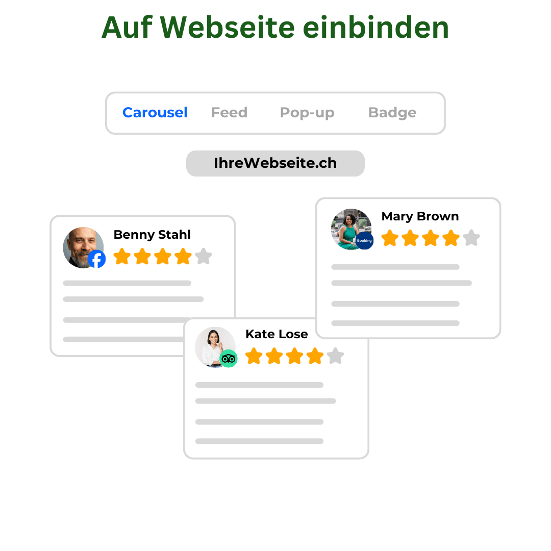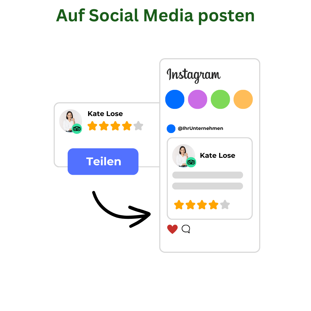 Teilen Sie Bewertungen auf Ihren Webseiten über Widgets oder auf sozialen Medien durch automatisch generierte Beiträge.