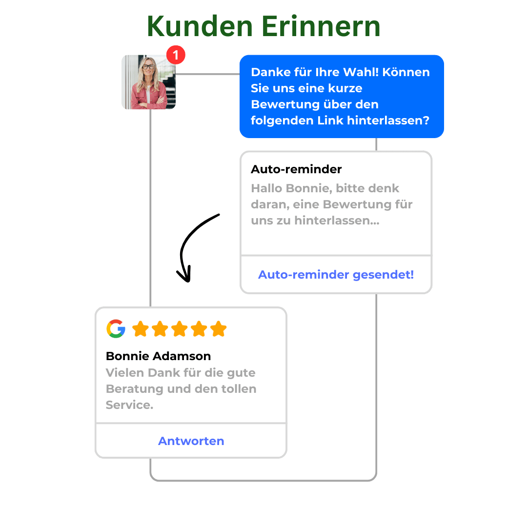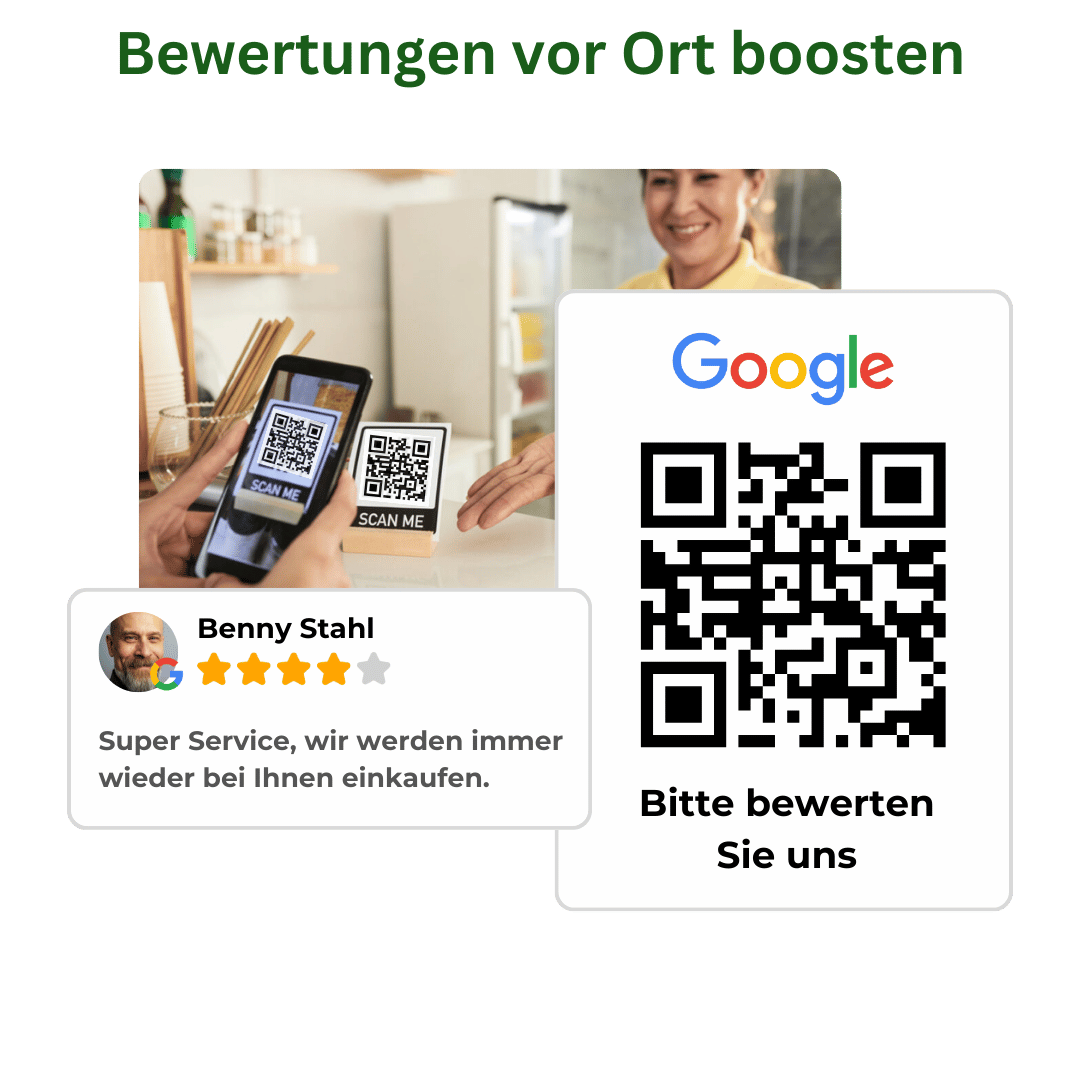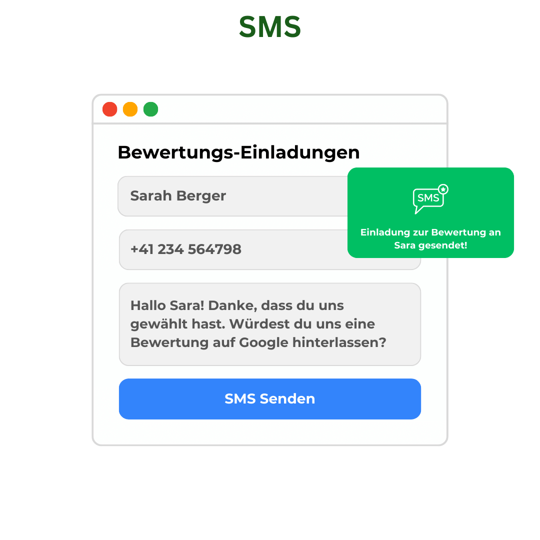 Einfach! Sie erhalten einen speziellen Bewertungslink, mit dem Sie Kundenbewertungen erfassen können. Diesen Link können Sie über unsere Plattform per SMS, E-Mail, WhatsApp versenden oder den QR-Code ausdrucken und überall anzeigen.
