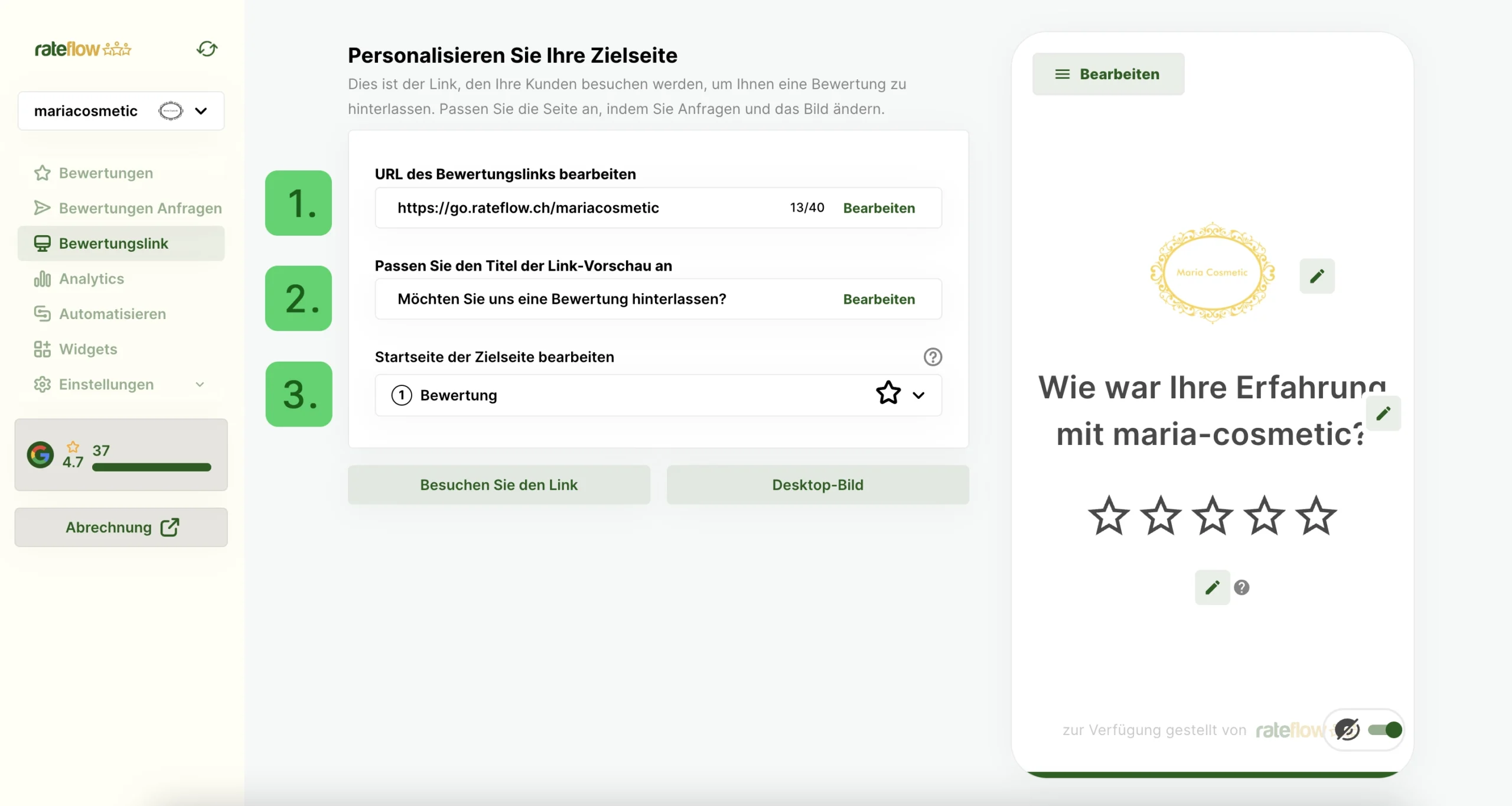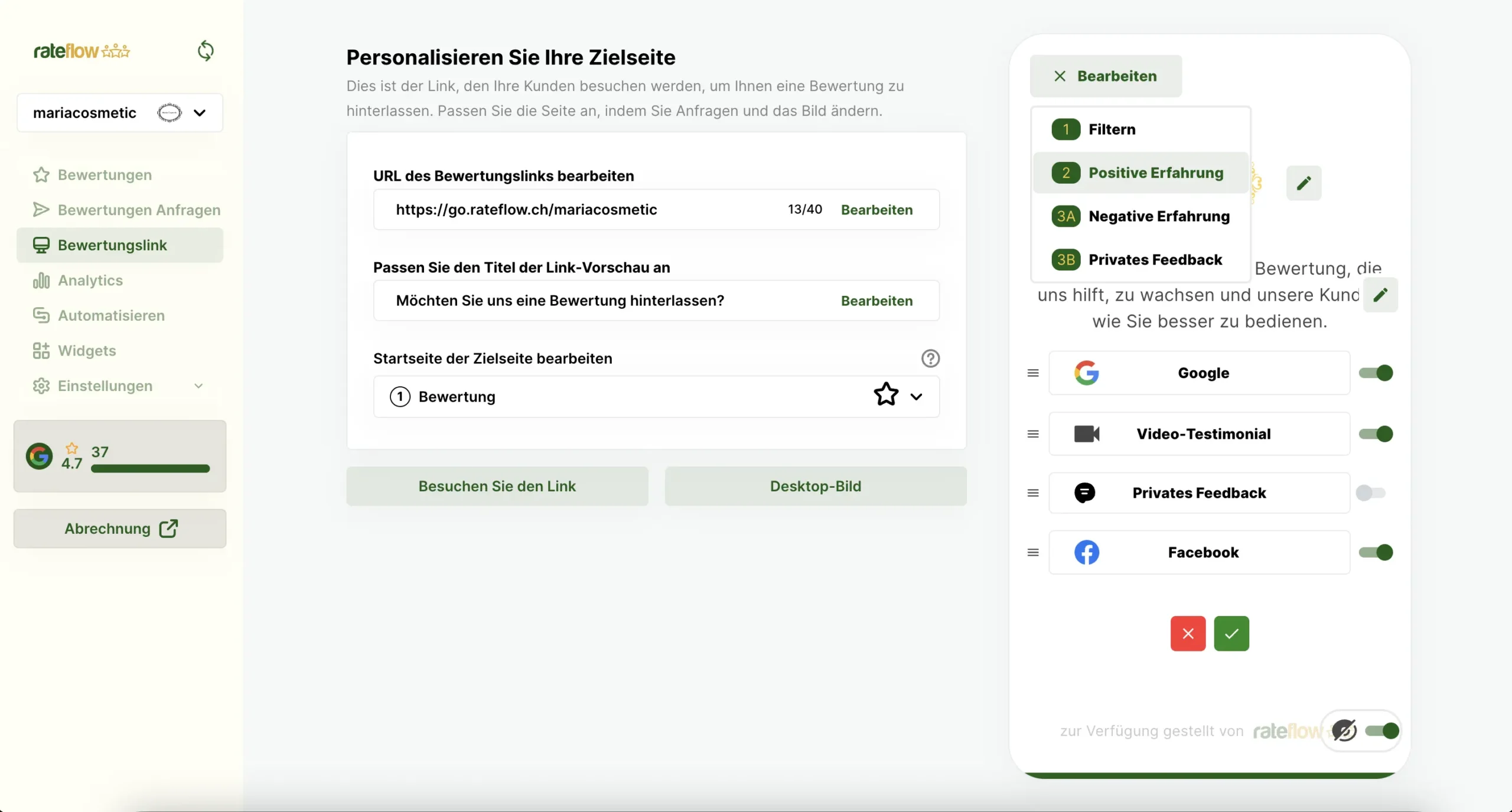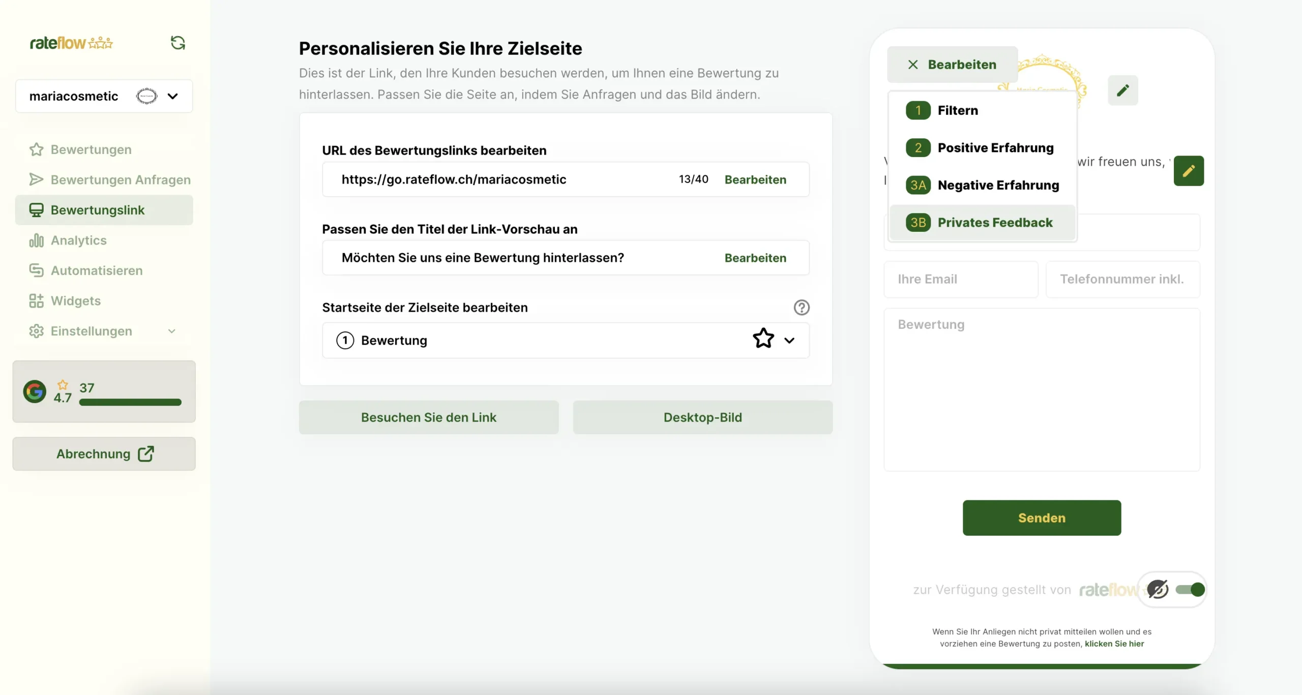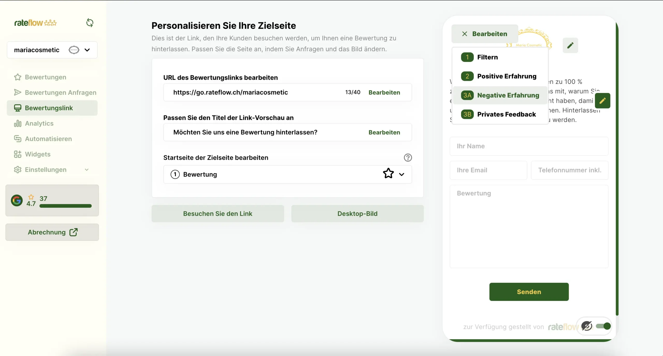 Der wichtigste Teil von Rateflow. Dies ist der Link, den Sie an all Ihre Kunden, Klienten und Patienten senden, um Bewertungen anzufordern. Auf dieser Seite wird den Nutzern ein privates Feedback-Formular angezeigt, wenn sie 1-3 Sterne anklicken, oder Optionen zur Abgabe einer öffentlichen Bewertung, wenn sie 4-5 Sterne anklicken. Diese Seite ist vollständig anpassbar, damit Sie den Link im Einklang mit Ihrer Markenidentität gestalten können.