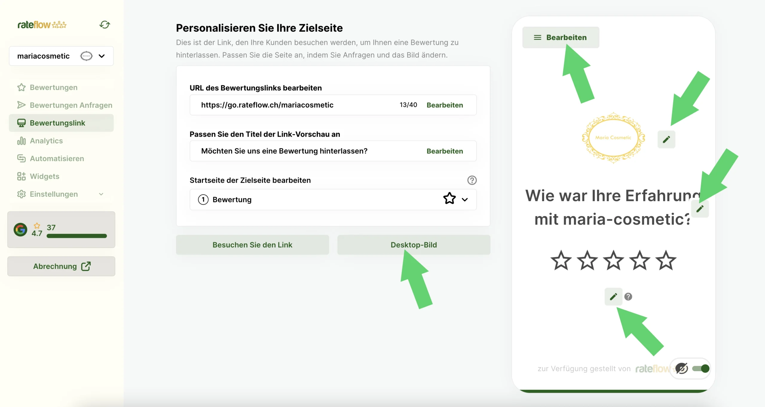 Ändern Sie Ihr Logo und den Text, den der Bewerter zuerst sieht. Passen Sie die Texte und Bilder an Ihre Markenidentität und Ihr Unternehmensimage an.