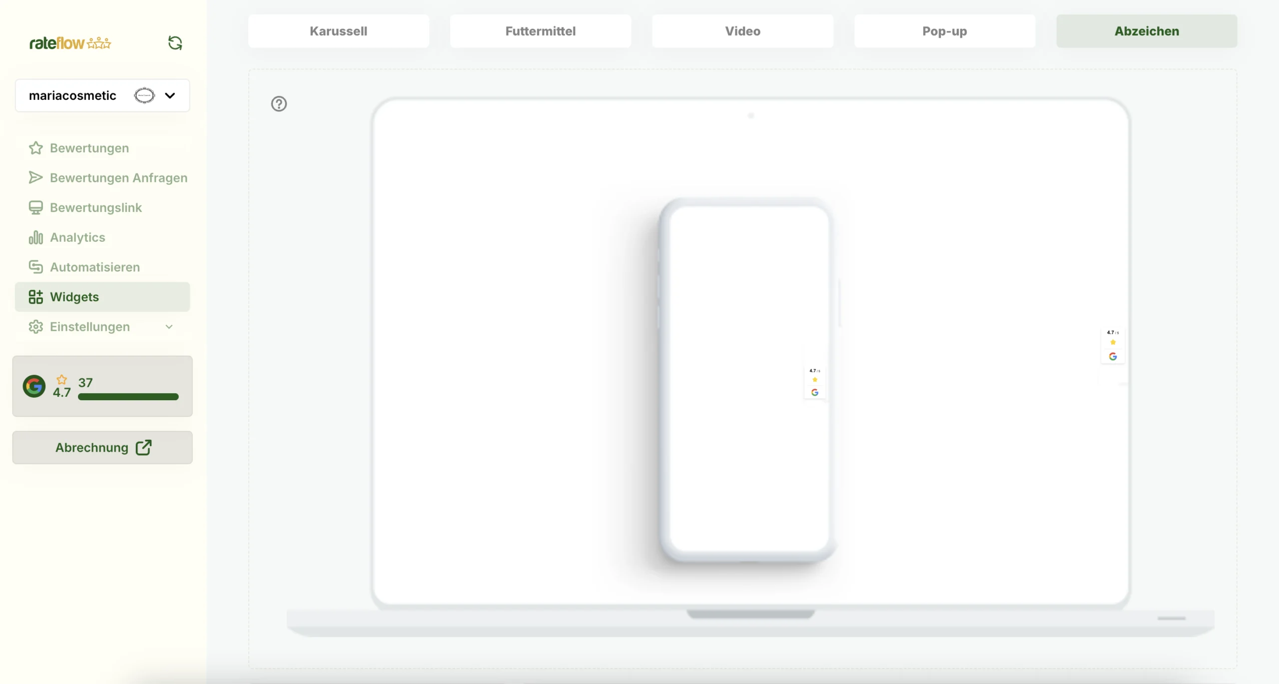 Möchten Sie nur Ihre Sternebewertungen für Ihre integrierten Plattformen anzeigen? Installieren Sie das Badge-Widget, und es bleibt auf allen Seiten, auf denen Sie es installieren, sichtbar.