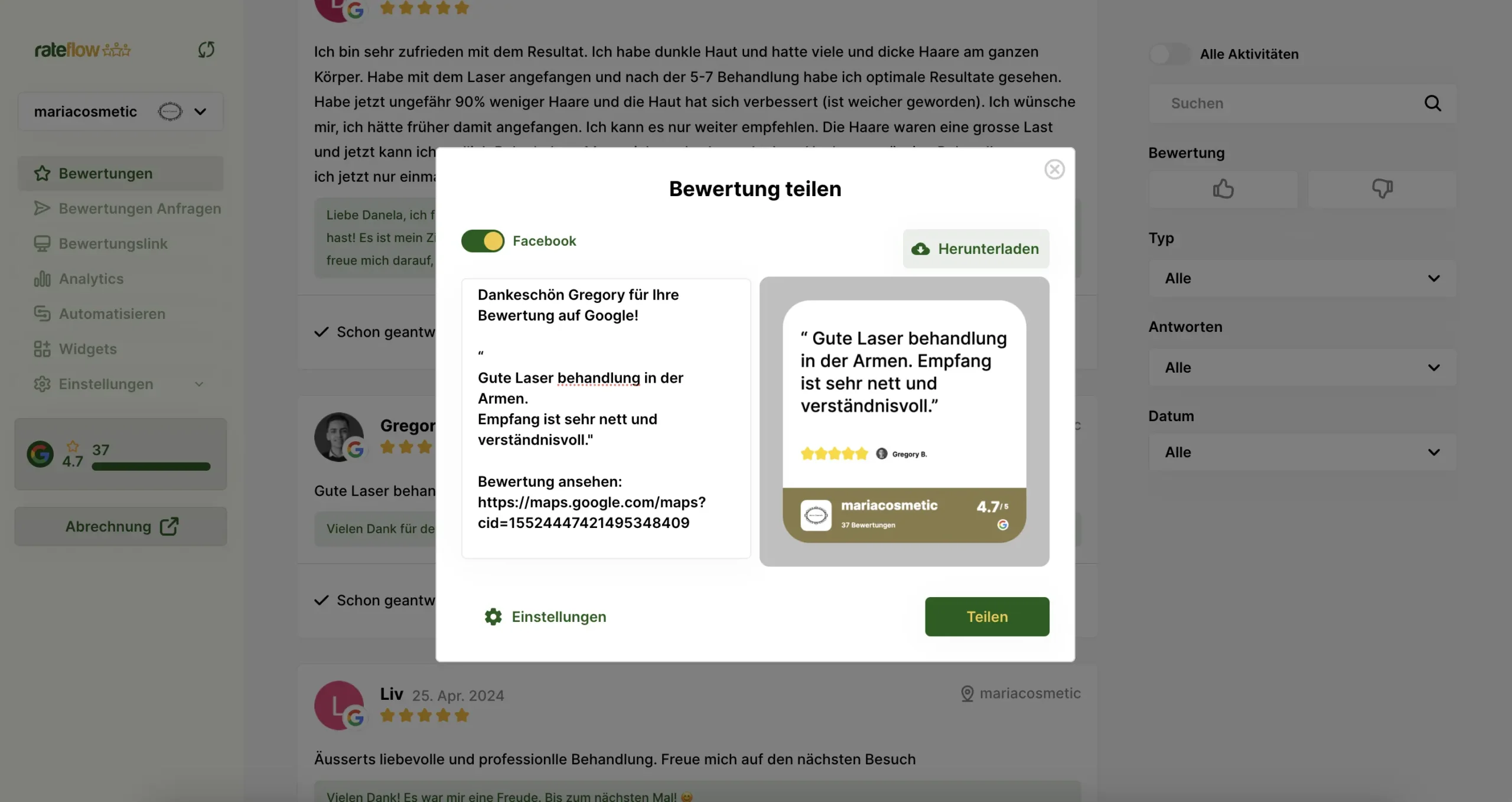 Sobald Sie Ihre sozialen Plattformen integriert haben, gehen Sie einfach zum Dashboard, suchen Sie die Bewertung, die Sie teilen möchten, und klicken Sie auf „In sozialen Medien teilen“. Wählen Sie die sozialen Plattformen aus, auf denen Sie die Bewertung teilen möchten, und klicken Sie auf „Teilen“.