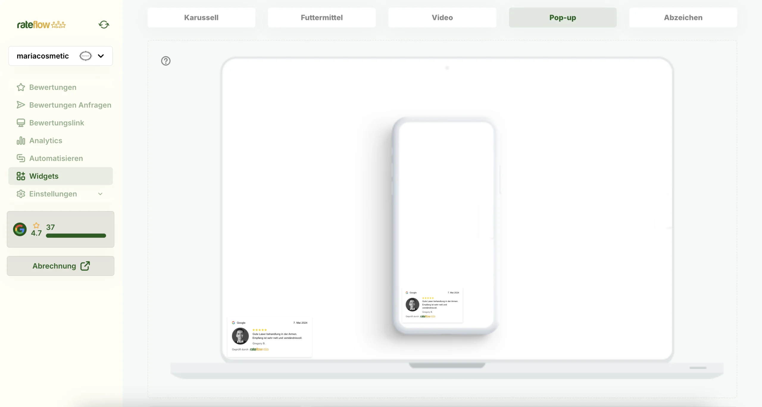 Zeigen Sie Ihre Widgets nacheinander an. Unser Pop-up-Widget zeigt automatisch alle Ihre Bewertungen nacheinander an, alle 20 Sekunden erscheint eine neue Bewertung. Ideal für E-Commerce-Shops.