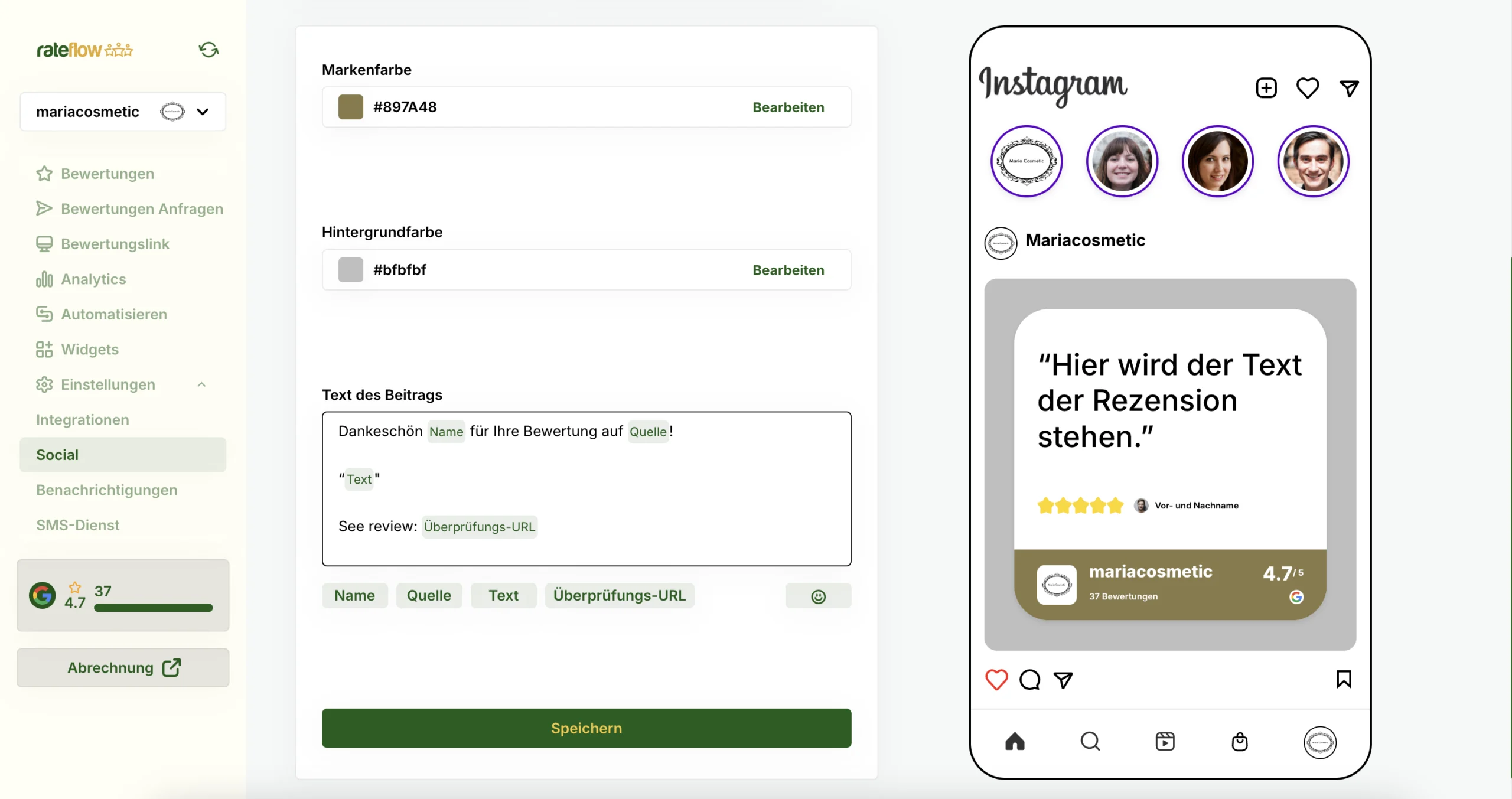 Möchten Sie Ihre Bewertungen in sozialen Medien teilen? Stellen Sie sicher, dass Sie Ihre sozialen Konten auf der Seite „Social“ verbinden und integrieren. Anschliessend können Sie anpassen, wie Ihre sozialen Beiträge aussehen sollen.